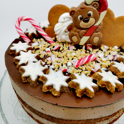 V kozico zlijemo 100 ml sladke smetane in nalomimo 100 g temne čokolade. Kozico damo nad nizek ogenj in mešamo, da se čokolada žametno stopi. S torte previdno odstranimo tortni obroč in acetatno folijo. Po vrhu torte prelijemo čokoladni ganache in pustimo, da se malce ohladi. Na koncu torto poljubno okrasimo z božičnimi sladkarijami.