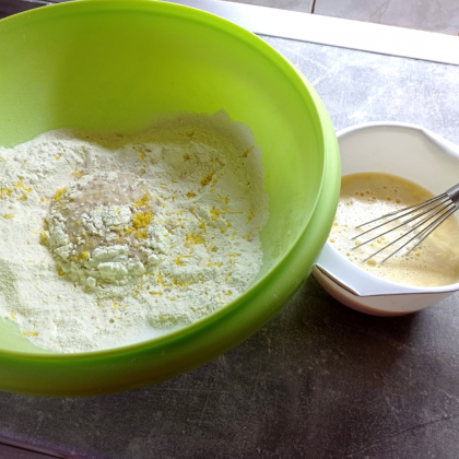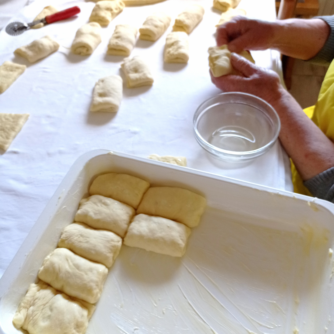 Moko in pecilni prašek preseješ, v moko narediš kvasni nastavek (kvas, malo mleka in sladkorja), premešaš in dodaš ostale sestavine (olje, sladkor, rum, vanilin sladkor, jajca in mleko – zmešaš skupaj). Na hitro premesiš in pustiš na toplem vzhajati, nato premesiš še enkrat.
