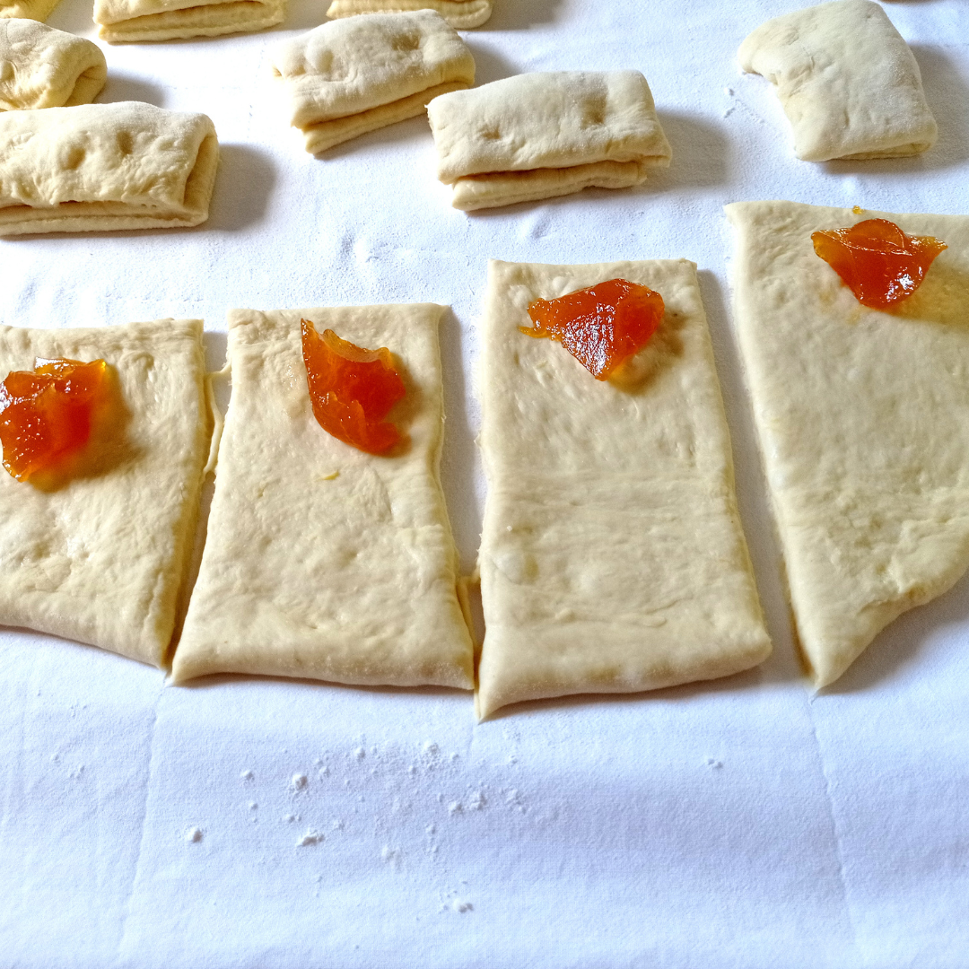 Ko je testo dvakrat vzhajano, ga razvaljaš na 1 cm debelo, razrežeš na trakove širine 8 cm. Nadevaš z marelično marmelado, prepogneš in odrežeš. Pekač namažeš z maslom ali ramo in zlagaš buhteljne enega zraven drugega. Robove stisneš in pomočiš v olje tam, kjer se dva robova stiskata skupaj.