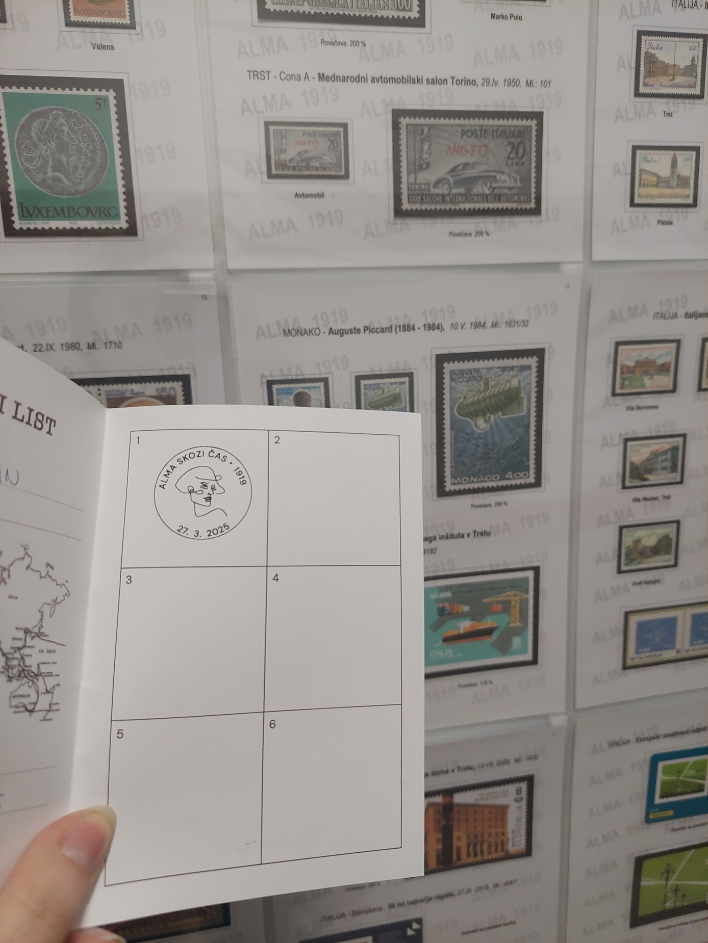 V potni list so nam pred odhodom na pot pritisnili Almin žig, ki je bil v podobi znamke in razglednice, ki so jo na SIC Alme M. Karlin izdali ob tej priložnosti. Znamka in razglednica naj bi še naslednjih devet let izšli vsakič drugačni. Da je bil dogodek še bolj svečan in poseben ter potovalno pobarvan, pa smo si lahko ogledali razstavo italijanskih znamk, ki jo je pripravil Tone Petek.