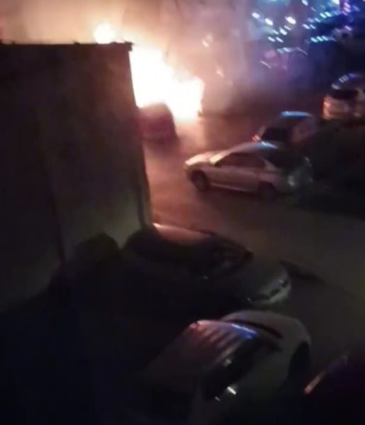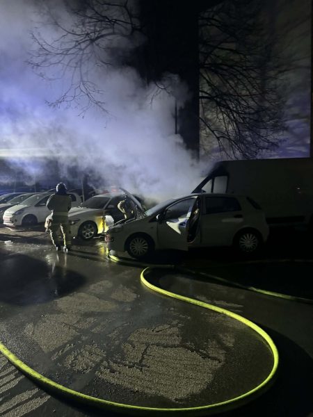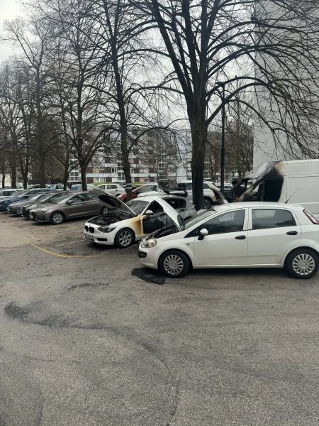drugi uri zjutraj posredovali na Trubarjevi, kjer je zagorelo osebno vozilo, ogenj pa je zajel še pet avtomobilov (na fotografijah). Štiri so povsem uničena.