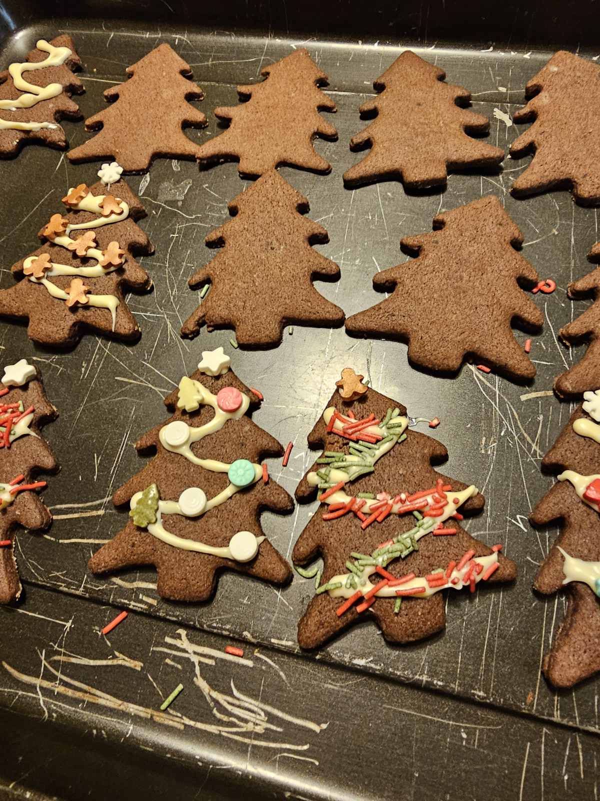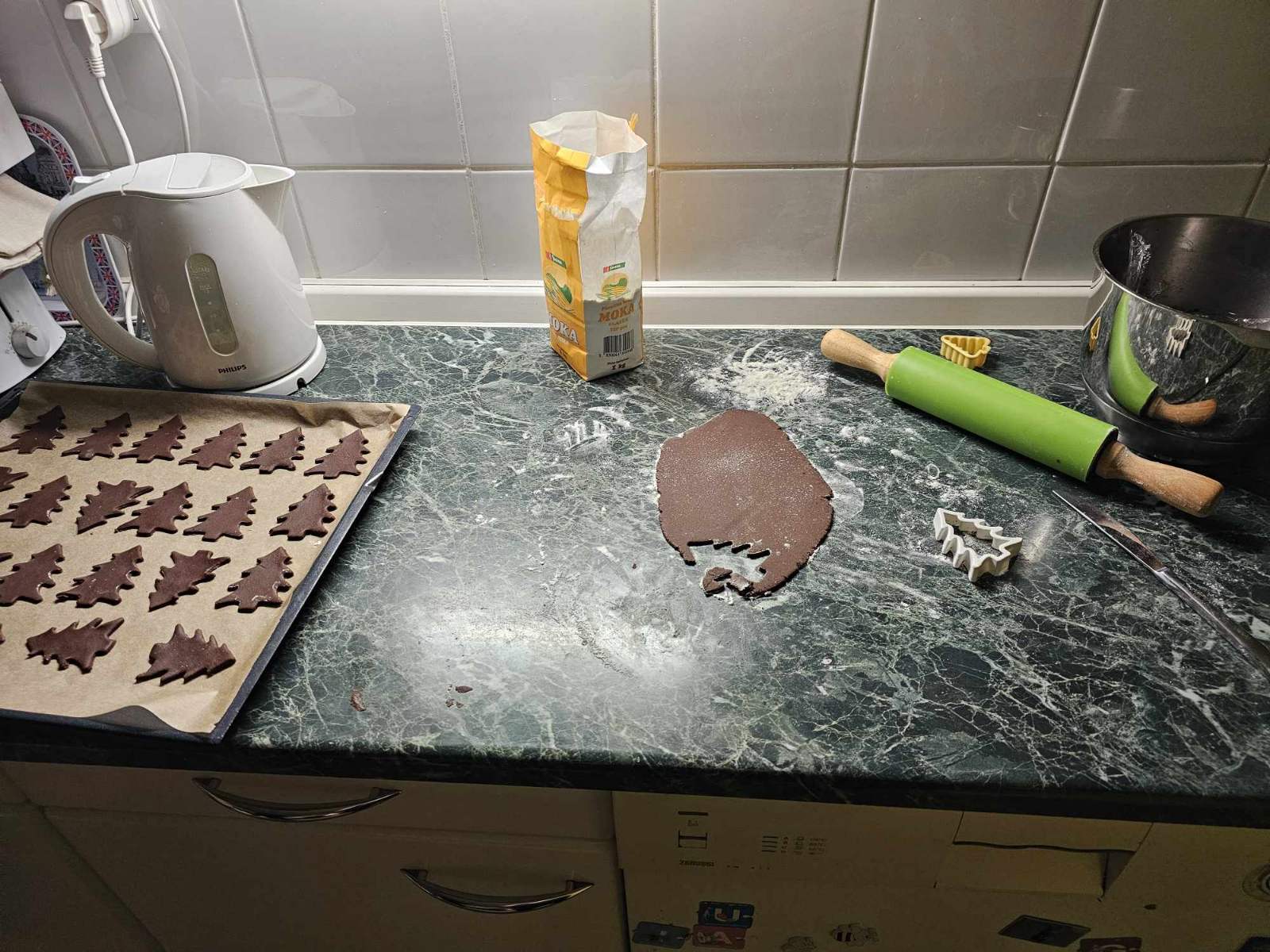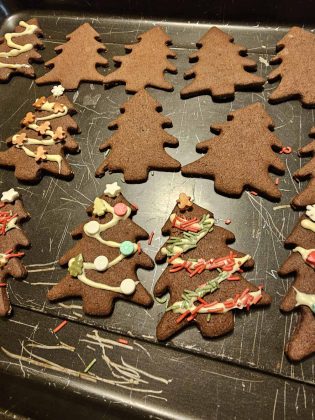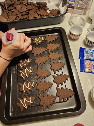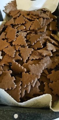 Testo na pomokani površini razvaljaj in iz njega izreži smrečice. Testo razvaljaj kar se da na tanko, da končni piškoti ne bo predebeli.