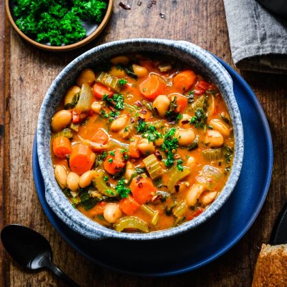 Zelenjavi dodamo kuhan fižol in še nekaj fižolove vode, gostoto enolončnice lahko uravnavamo po okusu z dodajanjem vode v kateri se je kuhal fižol. Kuhamo še 10 minut, da se okusi povežejo, na koncu potresemo s sesekljanim peteršiljem.