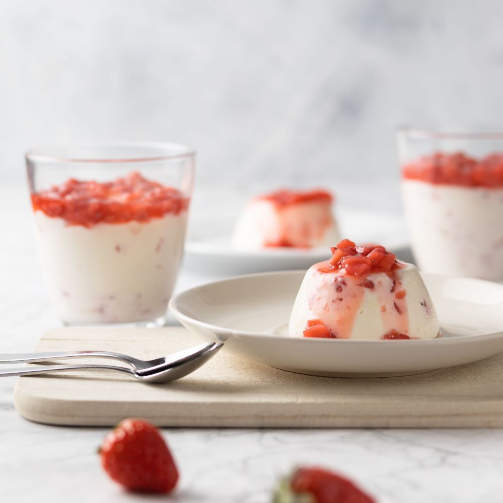 Želatino namočimo v mrzli vodi. Eno tretjino jagod narežemo in pokuhamo v kozici. Smetano in 150 g sladkorja v prahu stepemo, dodamo jogurt in premešamo. Primešamo raztopljeno želatino ter pokuhane jagode. Zmes vlijemo v okrogle modelčke ali silikonske modelčke za muffine in jo za 3 ure postavimo v hladilnik. Preostale jagode narežemo, jim  1 žlico sladkorja v prahu ter jih do serviranja postavimo na hladno. Jogurtovo strnjenko, ki smo jo previdno stresli iz silikonskih modelov, položimo na krožnik in okrasimo s pripravljenimi ohlajenimi jagodami.