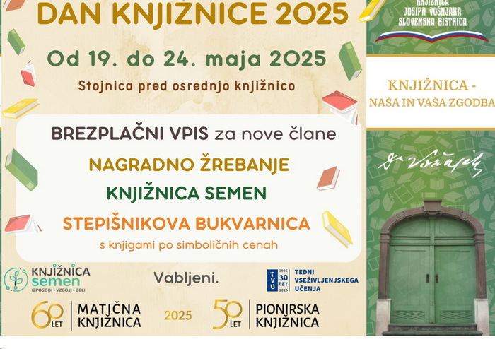 Knjižnica Josipa Vošnjaka Slovenska Bistrica obeležuje 25. maja Dan knjižnice. Vsako leto pred knjižnico postavijo stojnico in to za ves teden, kjer promovirajo svojo dejavnost. Tokrat je še bolj slovesno, saj Knjižnica letos praznuje 50-letnico ustanovitve Pionirske knjižnice in 60-letnico poimenovanja matične knjižnice.
