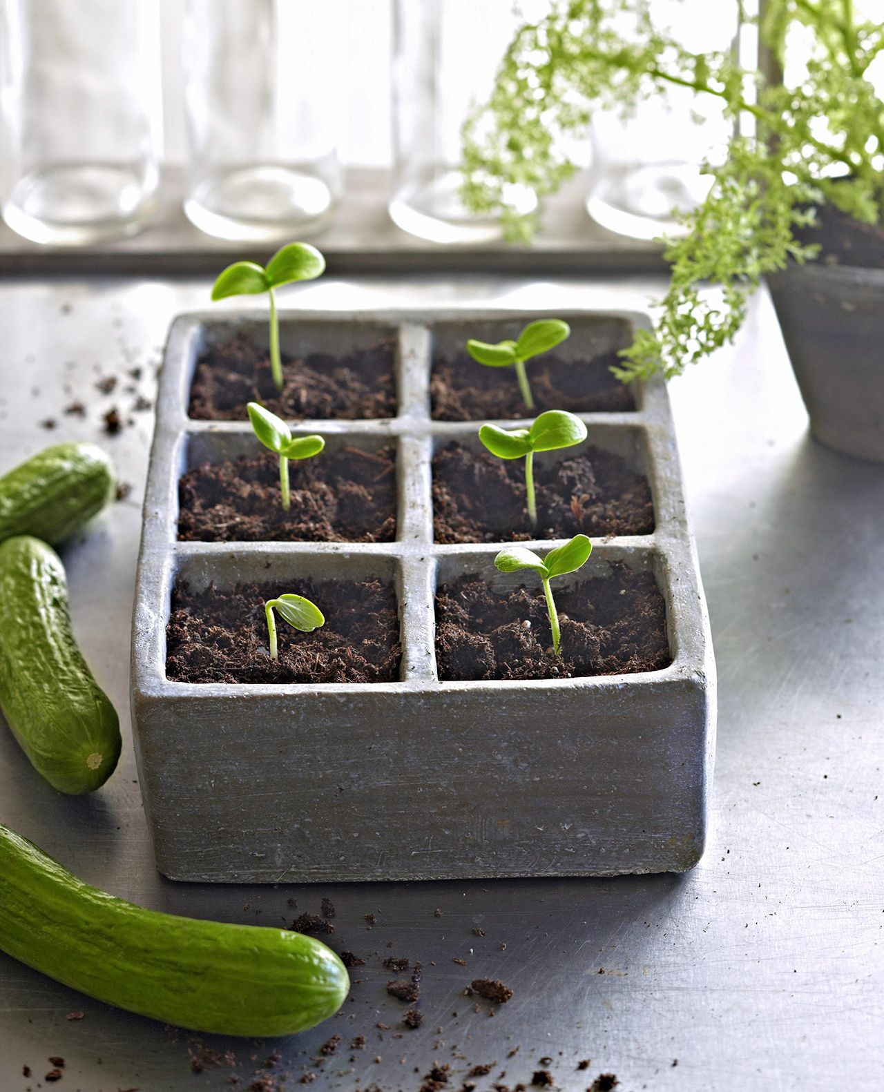 V drugi polovici aprila, za sadike, v lončke sejemo buče, bučke in kumare. Kalimo in vzgajamo jih v ogrevanem prostoru, saj za kalitev potrebujejo temperaturo okoli 25°C. Kumare sejemo enkrat letno neposredno na gredo ali si vzgojimo sadike. Vzgoja sadik je boljša izbira, saj se lahko zgodi, da seme pri direktni setvi na prosto ne vzklije. V posamezne sadilne posodice posejemo eno seme približno za dva prsta globoko. Ko sadika raste, postopoma dodajamo prst, dokler posodice ne napolnimo do vrha. Pogosto imajo sadike kumar dolgo steblo in s tem ga utrdimo. Ker kumare in bučke uspešno kalijo v temi, sadilne posode pokrijemo, saj bodo zaradi enakomerne vlažnosti boljše kalile. Odkrijemo jih takoj, ko opazimo prvi kalček, kar pa je lahko že v treh dneh, in takoj prestavimo na svetlo mesto. Ko se klična lista odpreta, je že čas za presajanje v veliko sadilno posodo. Če so se nam do sedaj rastline »pretegnile«, jih pri presajanju posadimo bolj globoko, do kličnih listov. Kumara raste zelo hitro, zato lahko semena sejemo tudi v veliko sadilno enoto. Sadike kumar zalivamo redno vsak drugi dan, kot tudi bučke in buče.