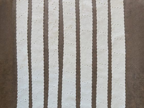 Listnato testo razrežemo na trakove, jih položimo na pekač, obložen s papirjem za peko, prebodemo z vilicami in spečemo v predhodno ogreti pečici, dokler ne postanejo zlato rjavi. Po peki testo ohladimo in nadrobimo na manjše koščke.