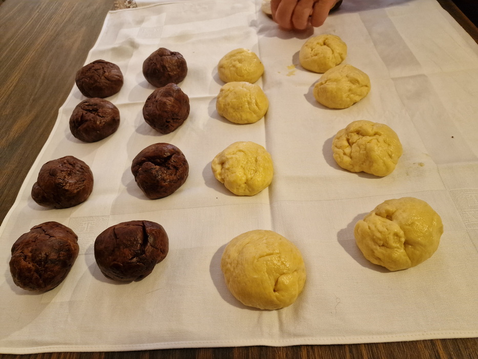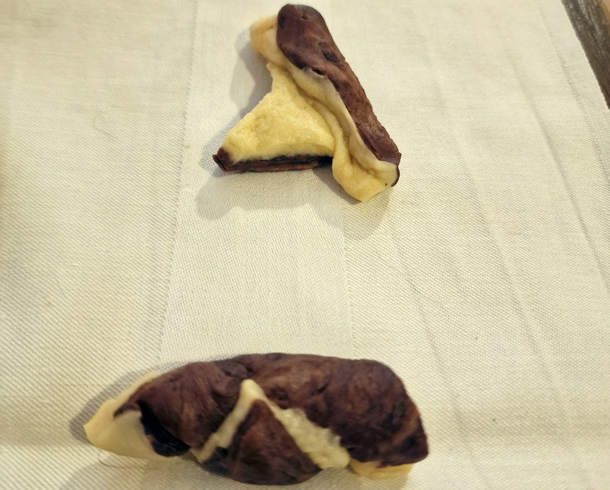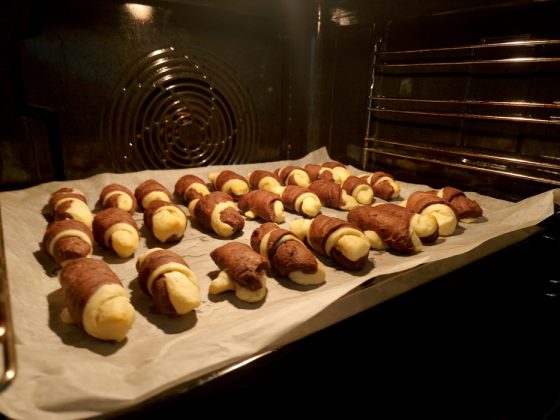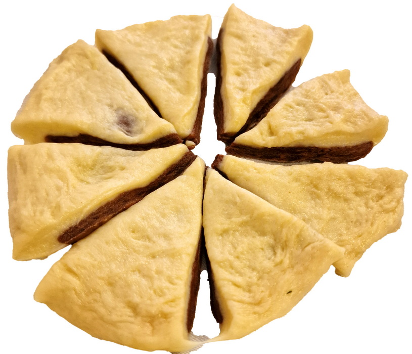 Nato vzamemo eno svetlo in eno temno kroglico, vsako posebej razvaljamo v krog in položimo svetlo testo na temnega ter razrežemo na 8 trikotnikov. Vsak trikotnik zvijamo od širšega proti ožjemu delu.