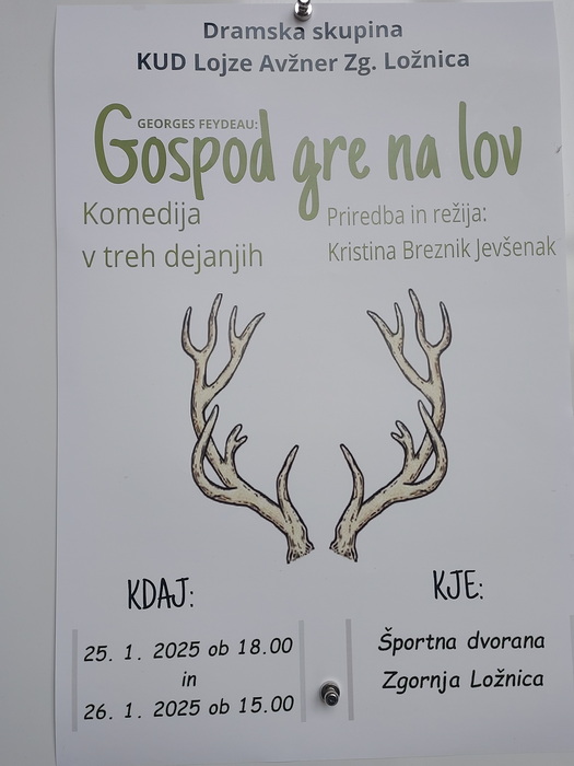 Dramska skupina Kulturno umetniškega društva Lojze Avžner Zgornja Ložnica bo jutri, 25. januarja, na domačem odru premierno uprizorila novo igro. Tokrat na oder postavljajo komedijo v treh dejanjih z naslovom Gospod gre na lov.