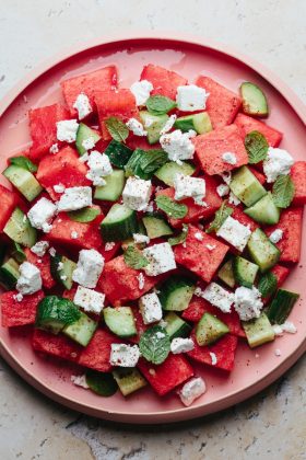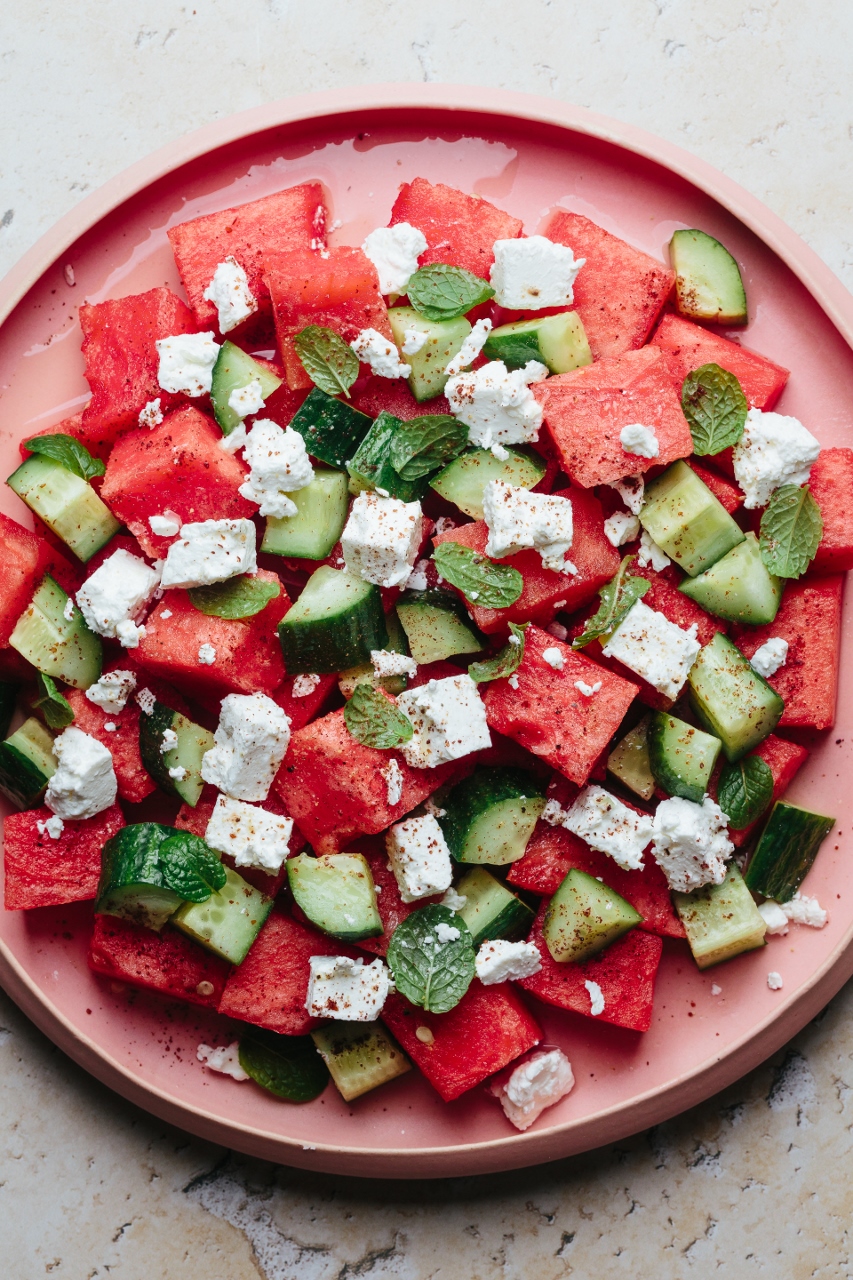 Čebulo razrežemo na tanke lističe in pokapljamo z limoninim sokom. Lubenico razrežemo na dober centimeter velike kocke in z noževo konico odstranimo semena. Kumarice olupimo in naribamo na tanke rezine. Meto nasekljamo na drobno. Pomešamo kocke lubenice, rezine kumarice, čebulo, nasekljano meto, nekaj žlic olivnega oja in malo soli ter popra. Solato za pol ure postavimo v hladilnik. Preden jo postrežemo, na solato potresemo kocke feta sira.
