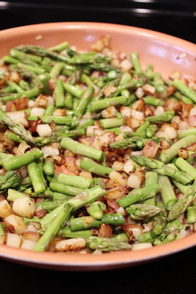 V ponvi ali voku na majhnem ognju počasi prepražimo narezano slanino, da spusti maščobo. Nato dodamo nasekljano šalotko in pražimo nekaj minut. Sestavine potisnemo ob rob ponve in na sredini na žlički olja na hitro popražimo česen, samo toliko, da zadiši, nato dodamo koščke špargljev. Pomešamo, solimo, popramo in pokrijemo ter dušimo nekaj minut, da se šparglji zmehčajo.