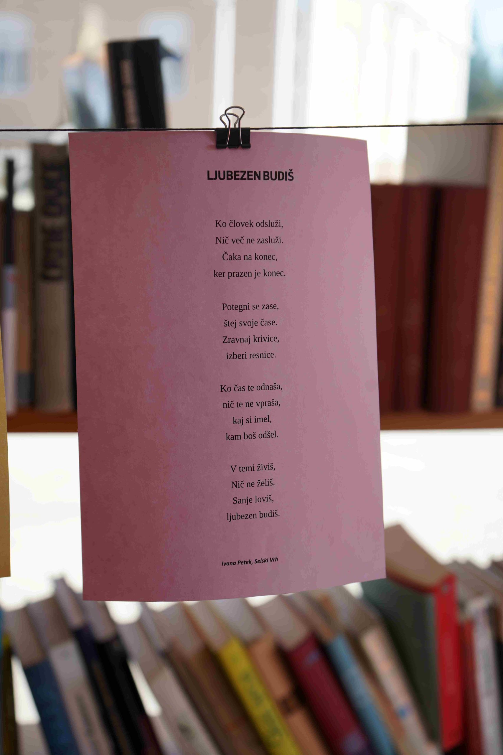 Izbrane pesmi natečaja smo razstavili v Minattijevi knjigobežnici, kjer jih še lahko prebirate. Prijetno dopoldansko druženje, ki ga je povezovala urednica Radia Rogla Valerija Motaln, je popestrila mlada saksofonistka Ariela Medved z Loške Gore, končali pa smo ga ob Minattijevi kavi, ki jo je postregel šef Puba Tattenbach Matjaž Štoleker.