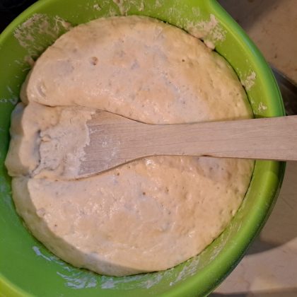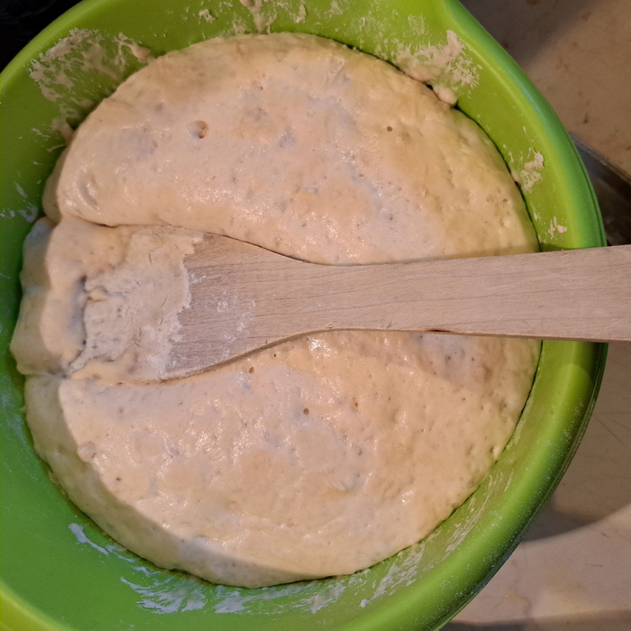 Postopek: v posodo presejemo moko in ji primešamo kvas ter sol. Prilijemo vodo in olje, nato pa vse skupaj gnetemo v testo. Ko je testo zgneteno, posodo pokrijemo in pustimo, da testo vzhaja na toplem mestu toliko časa, da naraste na dvojno količino.