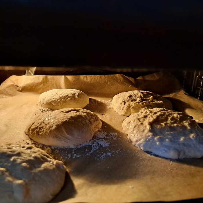 Vzhajano testo z rokami na hitro pregnetemo in razdelimo na cca 150 g kruhke, jih položimo na pekač, posujemo jih z malo ostre moke. Pustimo, da še enkrat vzhajajo.