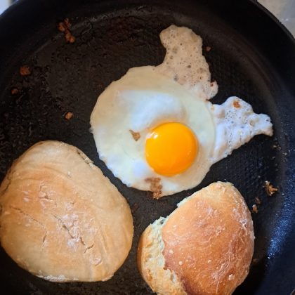 Ko kruhek prerežemo, ga popečemo v ponvi, v kateri se je pekel burger. In pričnemo s sestavo.