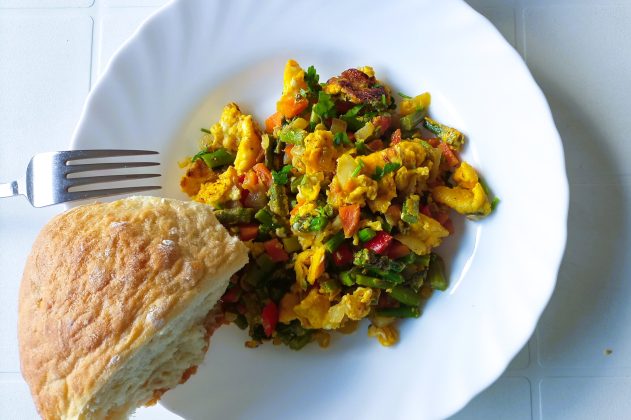 Umešana jajčka s šparglji in zelenjavo so odlična pomladna jed, serviramo jih s čebulnim ali kakšnim drugim nam najljubšim kruhom.