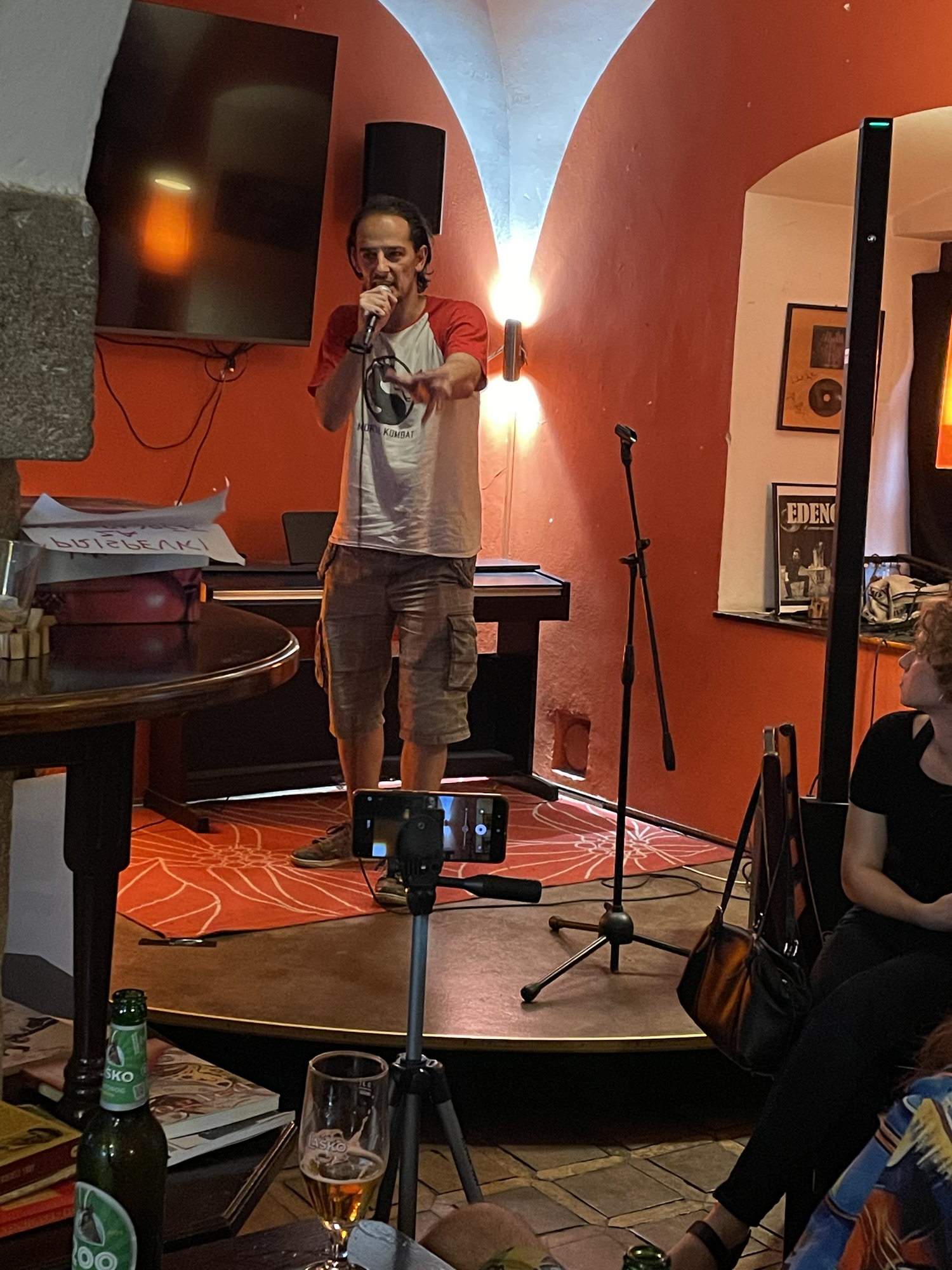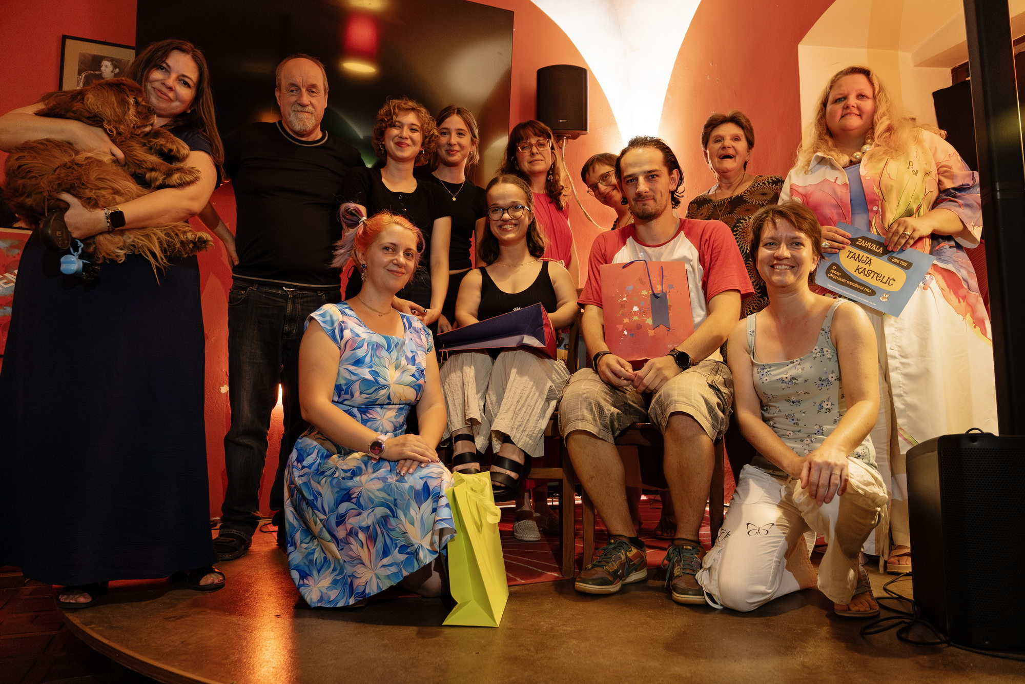 Minuli vikend je pred Špitalom za prjatle potekal predizbor za državno prvenstvo v slam poeziji 2025. Slam poezija združuje performans, govorjeno poezijo in gledališče, bistvena razlika med klasično poezijo in slamom pa je v tekmovanju, pojasnjuje Alenka Drevenšek iz Celjskega literarnega društva. Na odru v Špitalu so se zvrstili stari znanci in novi obrazi, skupaj osem nastopajočih, po dveh krogih pa sta se na zmagovalni oder povzpela Mišel Ristov in Ema Medved. Foto: Mira Gorenšek, Matic Ačko.